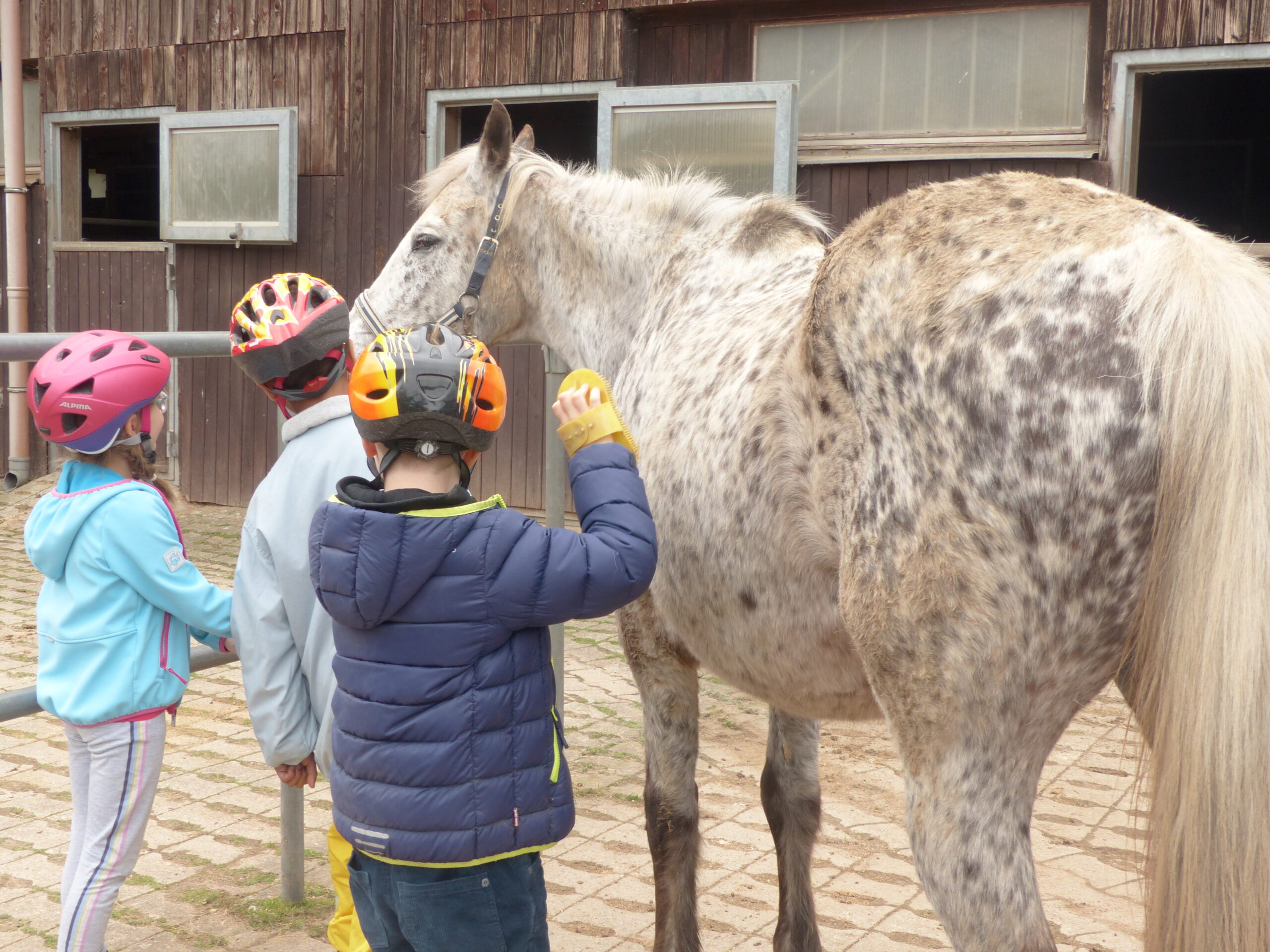 Michaela Winkler vermittelte mit viel Geduld und Einfühlungsvermögen das Basiswissen über Pferde und wichtige Verhaltensweisen im Umgang mit den großen Tieren. Die Schülerinnen und Schüler durften sich aber auch sehr schnell beweisen und das Erlernte an den zwei Pferden Frosty, Tiffy, und dem Mini-Pony Strubbl umsetzen. Die Kinder waren begeistert beim Striegeln, Bürsten und Hufe auskratzen dabei. Auch Kinder, die zunächst noch zurückhaltend im Umgang mit den großen Tieren waren, trauten sich immer mehr zu und suchten bald den Kontakten zu den geduldigen Pferden. Das Selbstbewusstsein der Kinder wuchs noch mehr, als sie lernten die Tiere alleine zu führen und somit die Verantwortung für das Tier und seine Reiterin oder seinen Reiter mit übernahmen. Natürlich durfte auch jedes Kind selbst auf einem Pferd sitzen und reiten.